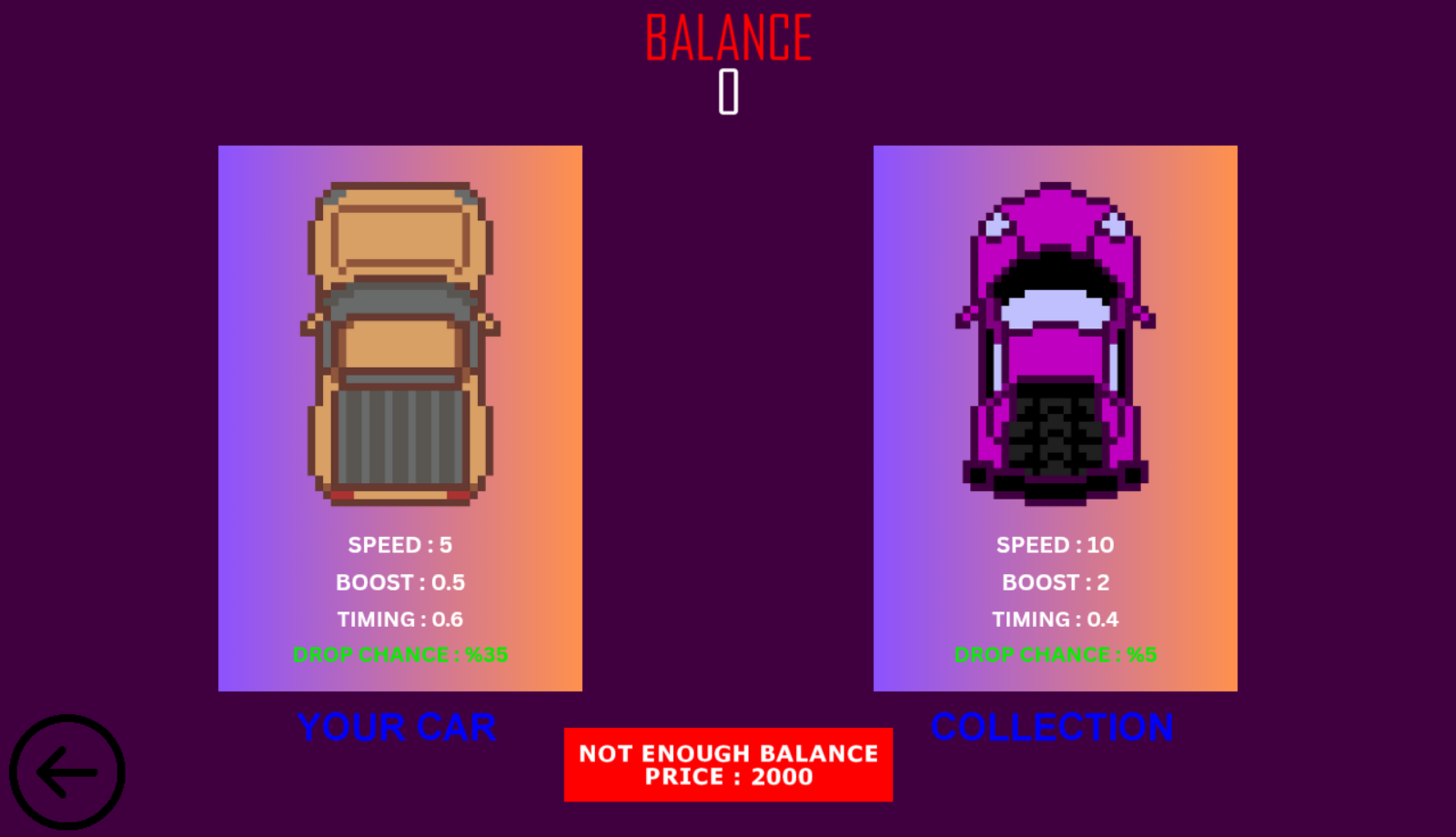Cars are unlocked through a luck-based system. More powerful cars are rarer than weaker ones.